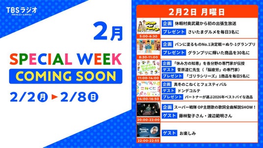 TBSラジオは2月2日(月)~2月8日(日)にかけて、各番組で特別企画をお届けするスペシャルウィークを開催します。ぜひリアルタイムでお楽しみください!
