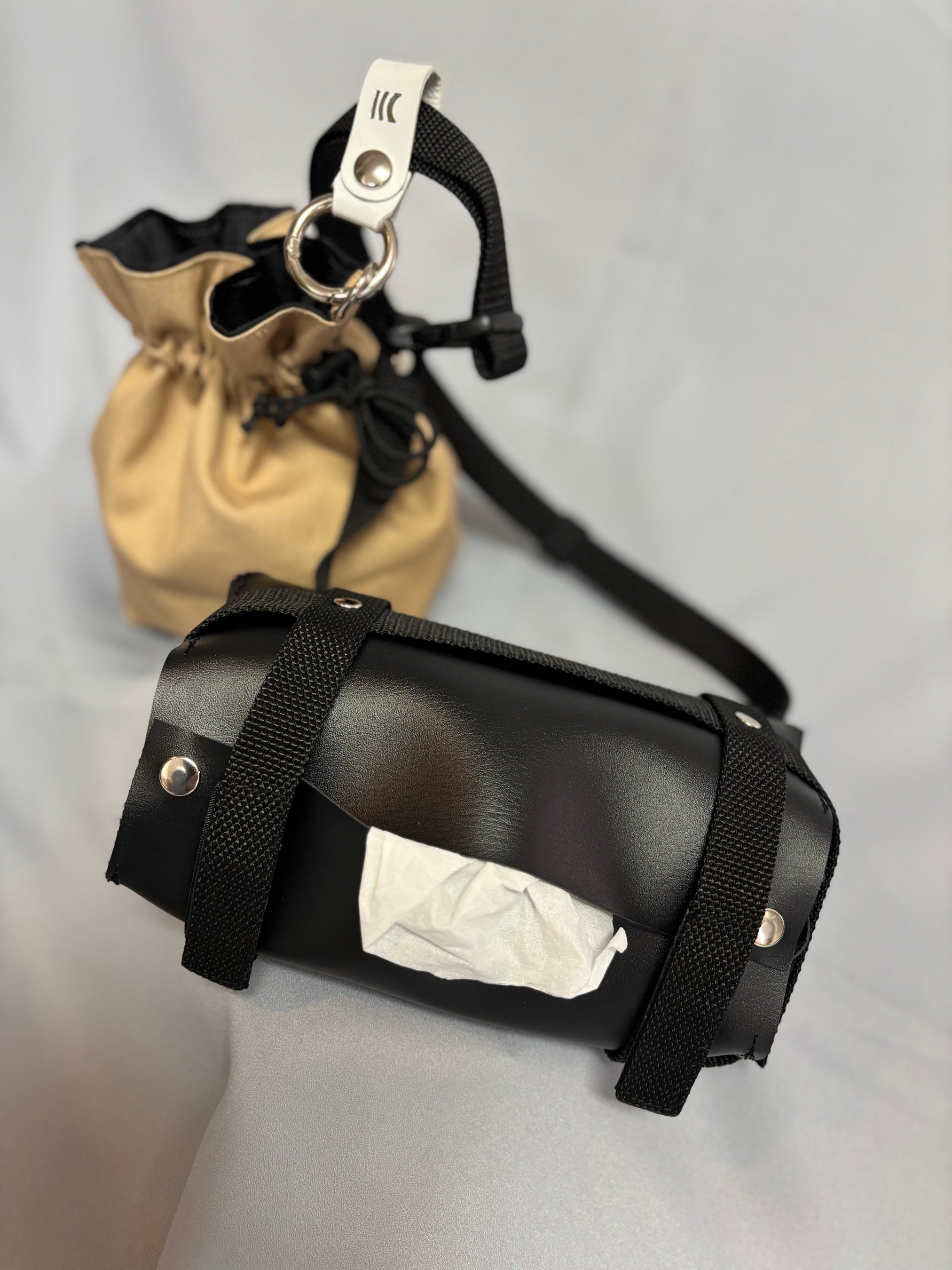 使用済みのティッシュを捨てるためのダストポーチ(専用巾着)がセットになっており、外出先でのゴミ問題を解決。