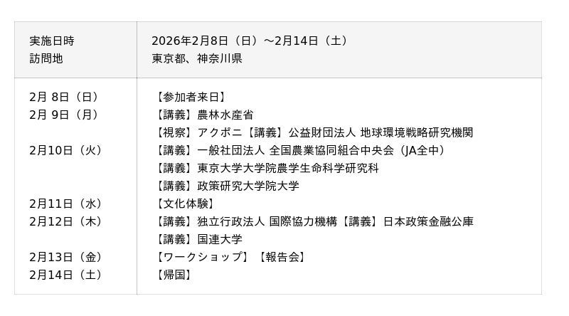 今回の訪問は、食料・農業・林業分野の課題解決、ASEAN統合の推進、そして開発格差の是正をテーマとしています。ASEAN事務局の FAFD課(食料・農業・林業課:Food, Agriculture and Forestry Division) と IAI & NDG課(ASEAN統合イニシアティブ・開発格差是正課:Initiatives for ASEAN Integration and Narrowing Development Gap Division) が主導し、特にカンボジア、ラオス、ミャンマー、ベトナム(CLMV諸国)および東ティモールにおける開発格差の是正に焦点を当てています。目的は、ASEANの食料・農業分野における課題解決に向けた組織能力の強化です。訪日団は AHEAD50プロジェクト を通じて、農業におけるデジタル技術の応用、持続可能な資源開発・管理、気候変動対策などの分野で知識を深め、実践的なアプローチを探求します。さらに、持続可能な農業や地域社会のエンパワーメント、循環型・グリーン経済、支援のための金融メカニズムといった戦略的テーマについても議論を行います。