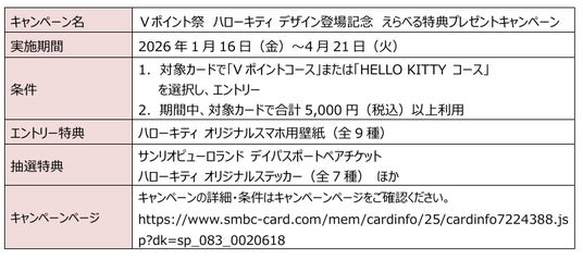 ハローキティ デザインの登場を記念し、三井住友カード会員を対象とした「Vポイント祭」において、ハローキティとのコラボレーションキャンペーンを実施しております。