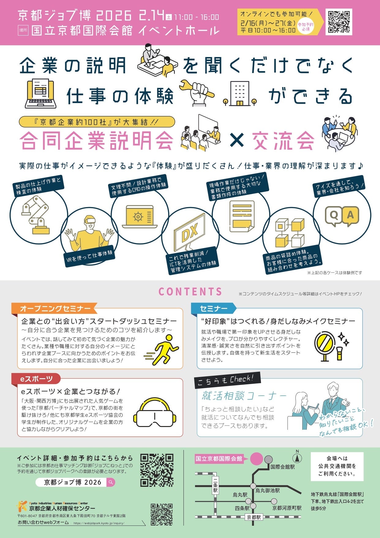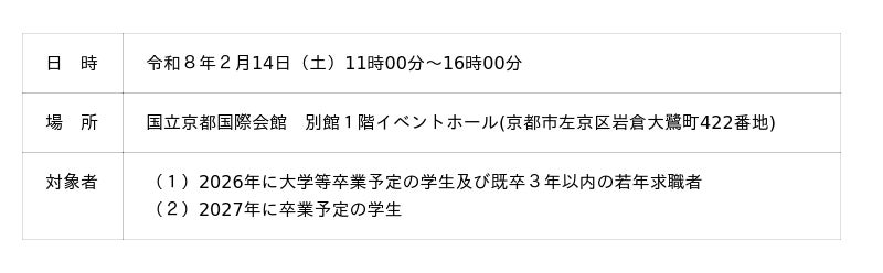 ■京都府では、学生等若年求職者に対し、働きやすい職場環境づくりに取り組む府内企業の企業研究を促進するため、約100社が参加する大規模イベント「京都ジョブ博2026」を2月14日(土)に、国立京都国際会館で開催します。