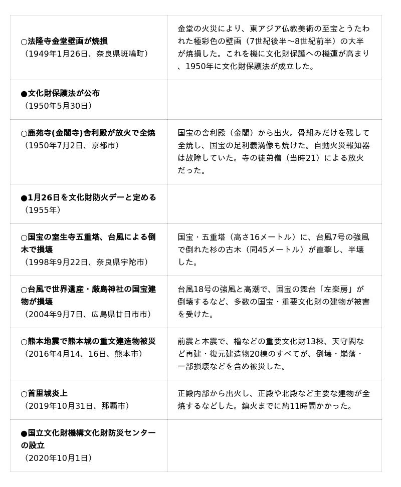 【国内の文化財をめぐる戦後の主な被災事案と文化財保護の流れ】