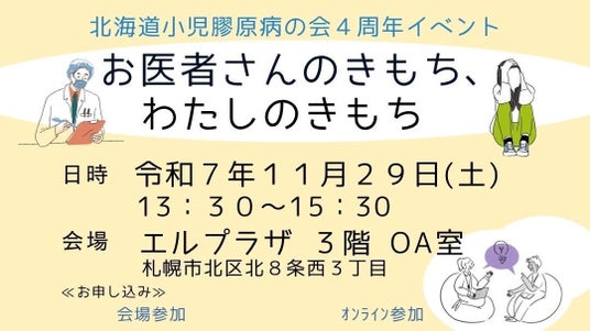 一般社団法人膠原病PR協会ミライ(代表理事:下條 真矢、所在地:東京都渋谷区、2025年7月3日設立)は、2025年11月29日(土)、札幌市エルプラザにて開催された北海道小児膠原病の会(代表:さくま しほこ、2021年12月25日設立、以下「同会」)主催の4周年記念イベント『お医者さんのきもち、わたしのきもち』に、協力団体として参加しました。