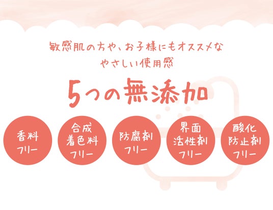 香料/合成着色料/防腐剤/界面活性剤/酸化防止剤を使用しない"5つの無添加処方*"で、やさしい使用感に配慮しました。