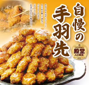 ■手羽先 サガミ不動の人気No.1の一品メニュー「自慢の手羽先」。その味は認められた味で、2018年手羽先サミットで殿堂入り認定を受けた逸品。タレ・塩より選べて、パリッとした皮とジューシーな肉の味わいが人気の商品です。