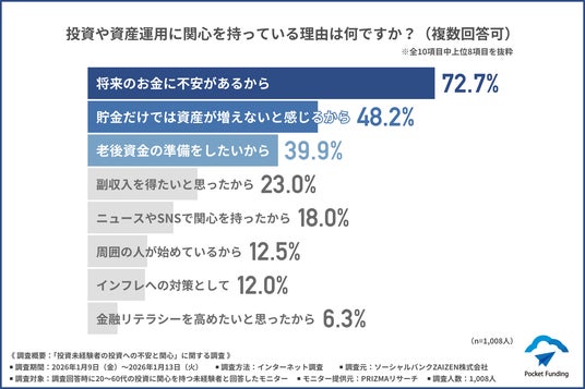 そこで今回、ソーシャルバンクZAIZEN株式会社(https://pocket-funding.jp/)は、20~60代の投資に関心を持つ未経験者を対象に、「投資未経験者の投資への不安と関心」に関する調査を行いました。