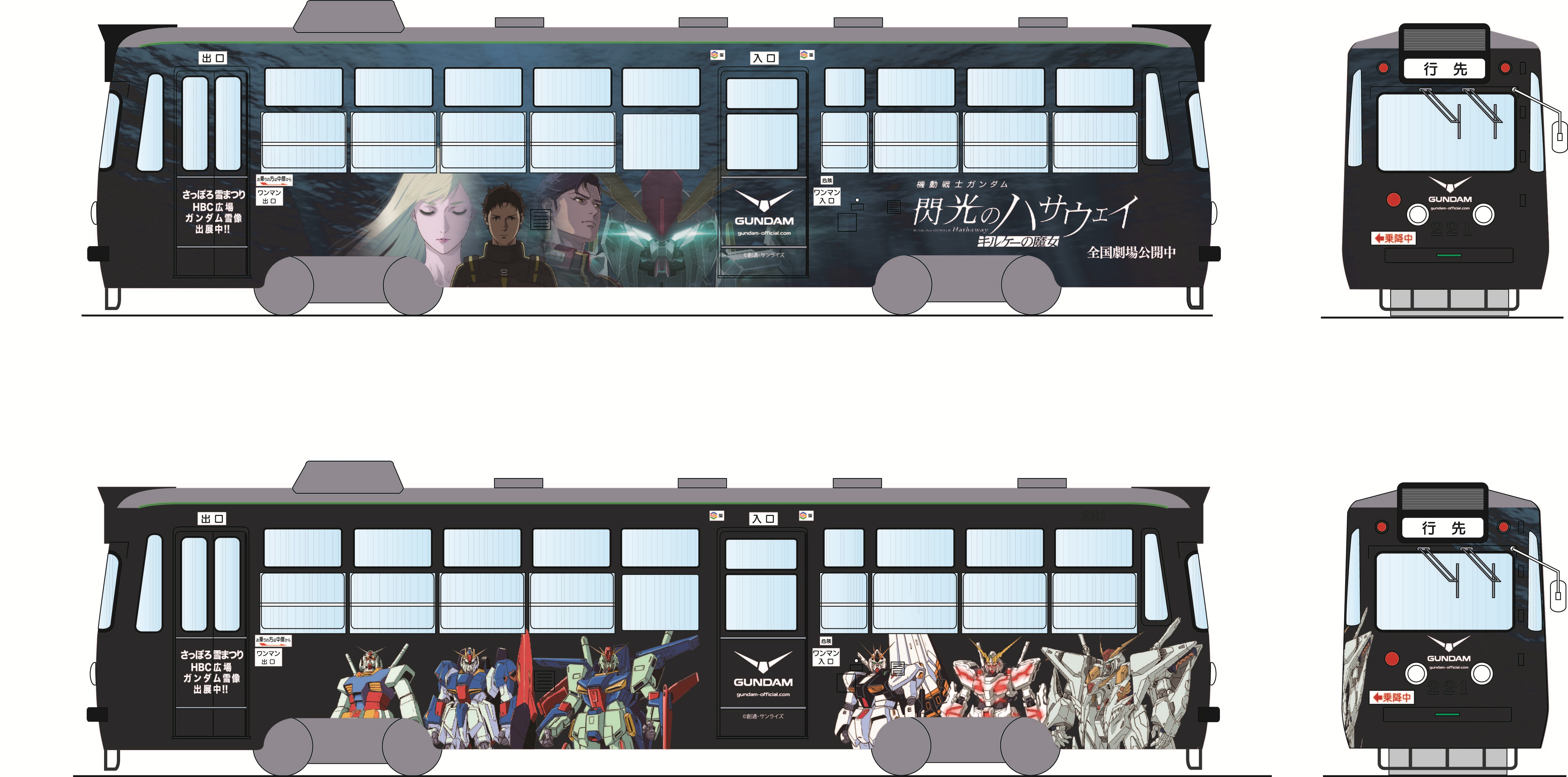 ガンダムが札幌市電を彩る!最新作『機動戦士ガンダム 閃光のハサウェイ キルケーの魔女』と、最新作に繋がる宇宙世紀のモビルスーツを全面にデザイン! -