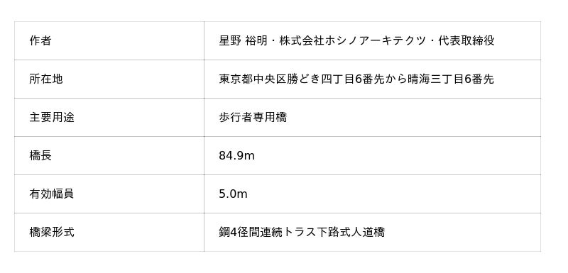 土木構造物であるために経済性が強く求められた条件の中でデザインを抑制されることがあったと推察されるが、建築家が強く関わることによりシンボリックな意匠が付加された橋の完成により、利便性の向上だけでなく橋を中心とした新たな景観の創生や周囲の街並みを活性化させることに貢献している。ここで実現した橋は単なる構築物ではなく構造、形態、照明などが一体に融合した工芸品であり美術工芸賞奨励賞にふさわしい。