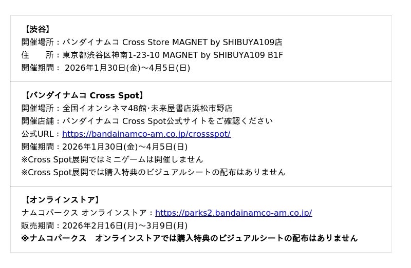 期間限定公式ショップは、渋谷にて2026年1月30日(金)~4月5日(日)に開催、また、バンダイナムコ Cross Spot全国イオンシネマ48館+未来屋書店浜松市野店 49店舗での開催も予定しています。