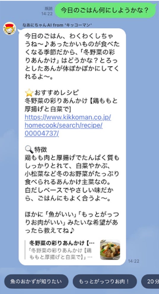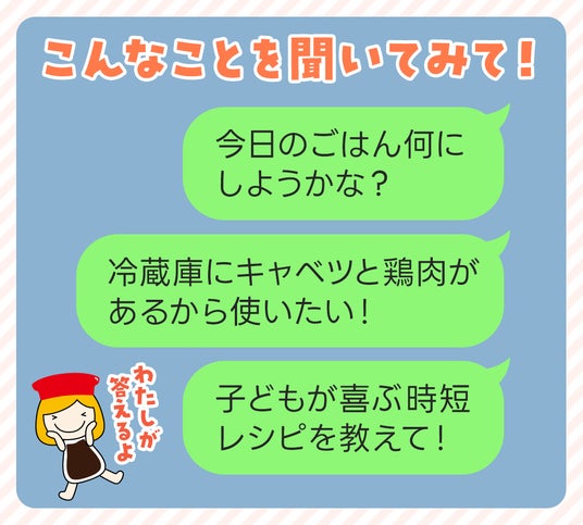 「みつかる♪きょうのごはん」は、キッコーマンの公式コーポレートキャラクターの「なあにちゃん」との自然な会話を通じて、レシピサイト「ホームクッキング」に掲載している9,000以上のレシピから、お客様の要望に合わせて最適なレシピを提案するサービスです。