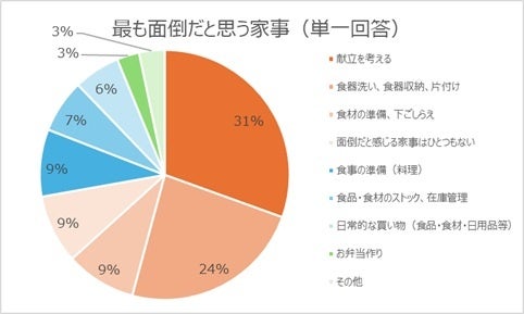 当社の調査(*)によると、料理にまつわる面倒な家事(複数回答)は、1位「献立を考える」(57.0%)、2位「食器洗い、食器収納、片付け」(53.0%)、3位「食材の準備、下ごしらえ」(38.8%)でした。また、最も面倒な家事(単一回答)として「献立を考える」と回答した人は30.5%でした。