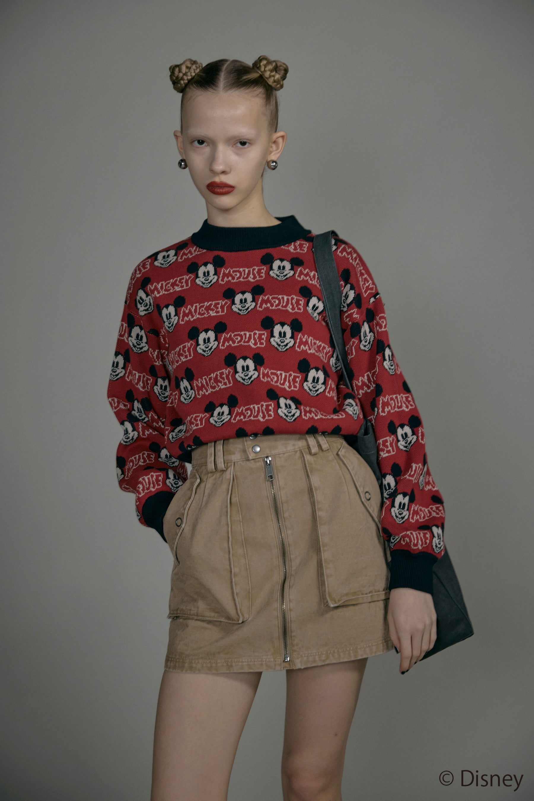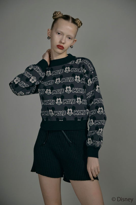 「ミッキーマウス」のロゴとお顔を総柄で表現した、存在感抜群のニットトップス。