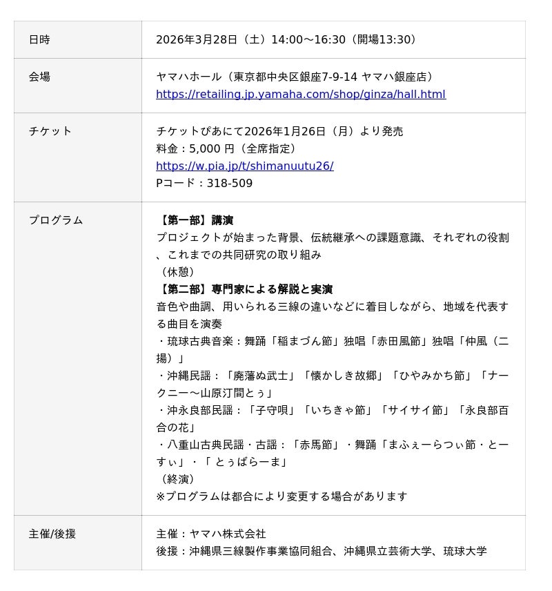 ヤマハ株式会社(以下、当社)は2026年3月28日(土)、ヤマハホールにてレクチャーコンサート『しまの音 -研究と演奏でひもとく、三線の未来-』を開催します。本公演では、当社が沖縄三線文化継承プロジェクトで進めてきた共同研究の紹介とともに、次世代を担う実演家たちの演奏をお楽しみいただけます。