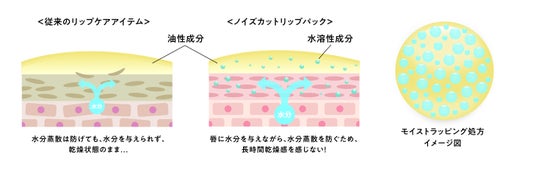 従来の*³リップアイテムは、水溶性成分をほとんど配合せず、油性成分で唇の表面を覆うことで乾燥を防いでいました。一方で「水分を補う」機能がないため、もともと乾燥している唇に対しては、根本的な乾燥の解消につながらないという欠点がありました。そこでノイズカットリップパックでは、水分を抱えこむ「モイストチャージ成分*⁶」を70%以上配合。唇の内部にたっぷりの水分を補給することで、唇の乾燥を根本*⁴から防ぎます。