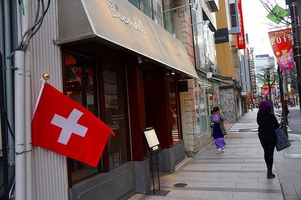 銀座8丁目を一筋入った場所です、スイス国旗が目印ね!
