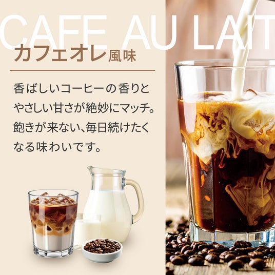 インスタントコーヒーを使用した本格的なコーヒーの香りに、ミルクのやさしい甘さをほんのりと加えたカフェオレ風味。