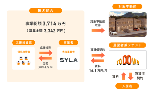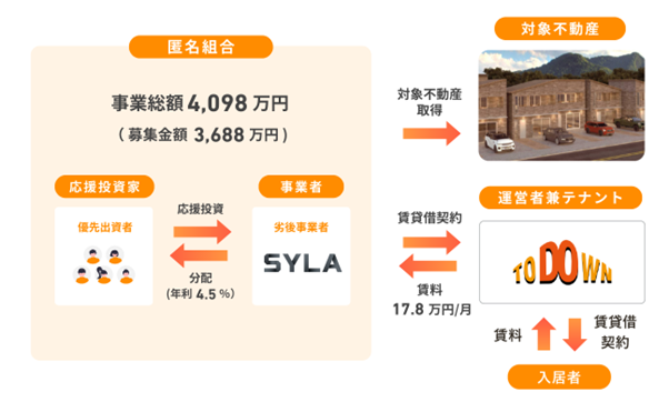 “応援を新しいカタチで”をコンセプトに、一口1万円から、社会貢献や地域創生、誰かの夢や挑戦に繋がる不動産に応援投資ができる“応援型不動産クラウドファンディングプラットフォーム”です。