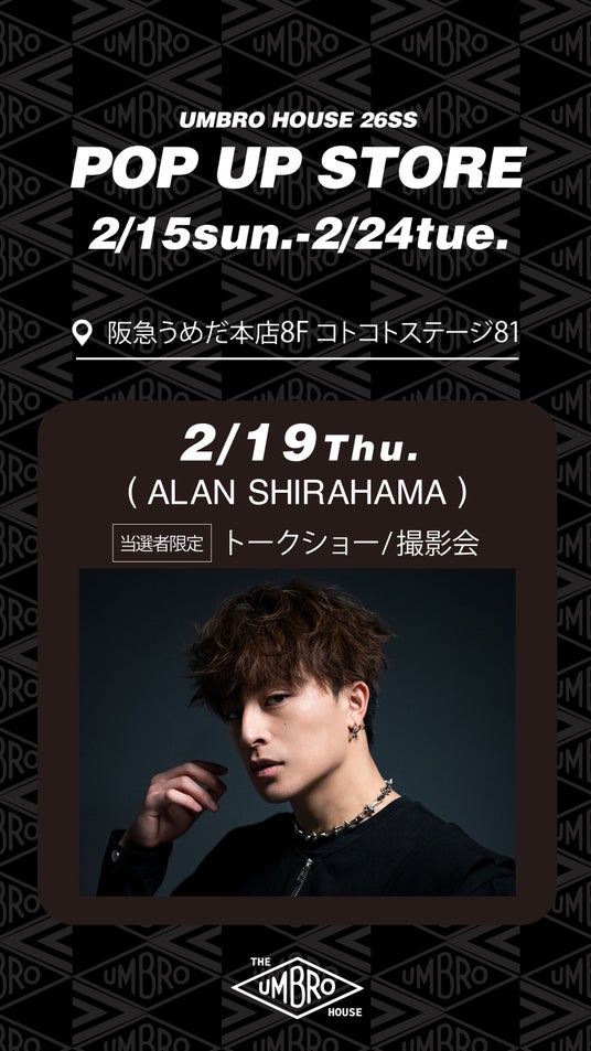 UMBRO HOUSEが阪急うめだ本店で期間限定のPOP UPを開催します。UMBRO HOUSE 26-27SS COLLECTIONに加えて、「UMBRO KOREA(20日発売)」一部商品や「第2弾 MR. MEN LITTLE MISS × UMBRO HOUSE」、「ALAN SHIRAHAMA×UMBRO(19日発売)」のスペシャルコラボ商品を販売します。この度、UMBRO HOUSEのPOP UP EVENT を盛り上げるため、2月19日(木)にALAN SHIRAHAMA氏が登壇します。