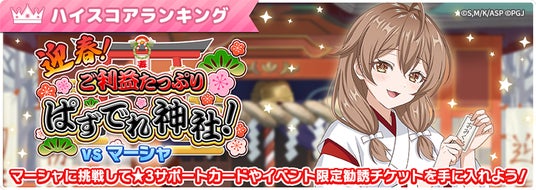 1月27日(火)12:00よりイベント「迎春!ご利益たっぷりぱずでれ神社!VSマーシャ」を開催します。当イベントでは、期間中のハイスコア順位に応じたランキング報酬が獲得可能です。またイベントステージで集めたポイントで、イベント限定のサポートカードやアイテムが獲得できる交換所も登場。繰り返し挑戦してよりたくさんのポイントを集め☆3サポートカードや勧誘チケットを手に入れよう!