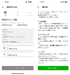 キャンプ場利用における注意事項や利用規約はアプリ上で確認できるため、受付での口頭説明による負担を軽減します。これにより従来配布していた紙での案内を省略することも可能となります。