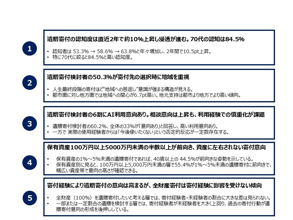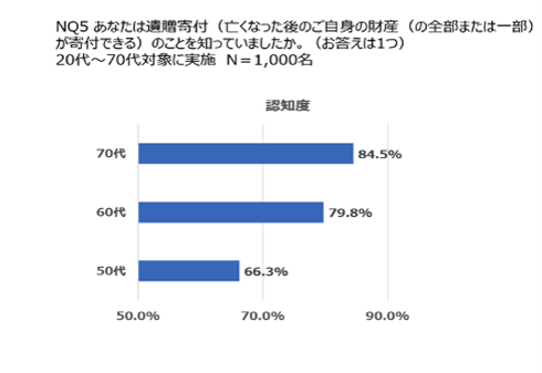 1.遺贈寄付の認知度は直近2年間で10%UPし浸透が進む。特に70代は84.5%が認知