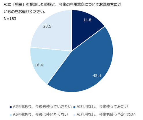 AIへの相続相談についての利用経験ありは11.4%と回答しており、相続の領域でもAIが利用されていることがわかりました。AI相談への期待値は高く、20代から70代を対象とした調査において全体の33%が「AIへの相談意向あり」と回答しています。