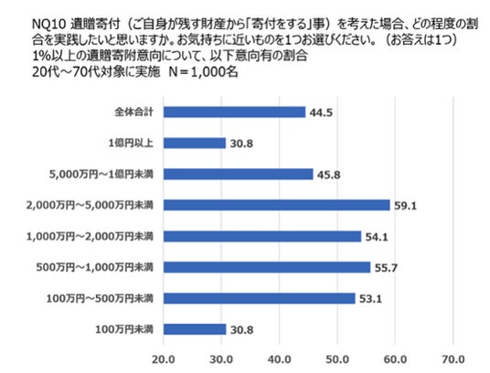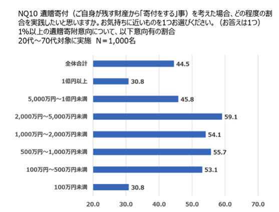 20代から70代を対象とした遺贈寄付に関する全体調査の結果、保有資産の1%以上を遺贈寄付として割り当てたいと考えている方は44.5%であることが明らかとなりました。