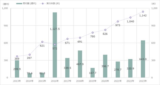 2023年度は、全国で1,142件が実行され約643億円が遺贈寄付されており、昨年度に比べると、金額は倍増し、件数は約10%の伸びを見せている。10年間の経年で見ると、金額には若干のばらつきが見られるものの、認知度の向上や高齢化による死亡者数の増加も相まって、実行件数は増加傾向を維持している。