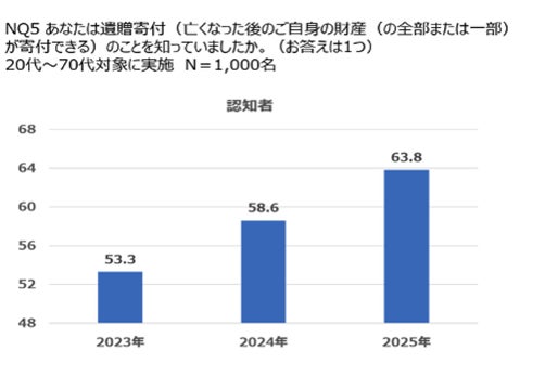 遺贈寄付の全体認知度(20代~70代)は調査以降、年々上昇していることが確認されました。2023年には53.3%、2024年には58.6%、そして今回の2025年調査では63.8%と、毎年およそ5%ずつ増加しています。50歳以上のカテゴリーでは、認知されている割合が非認知を上回っており、特に70歳では84.5%が認知しており、この世代では遺贈寄付が周知された状況です。