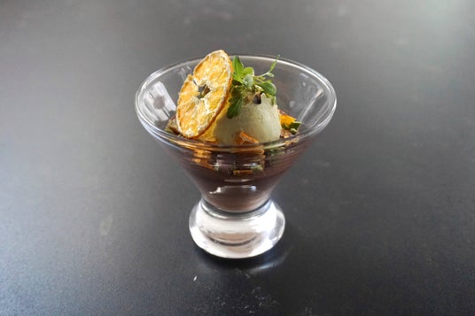 濃厚でなめらかなチョコレートのパンナコッタに、香ばしさとコクを感じるピスタチオアイスを合わせました。仕上げには国産みかんを丁寧に輪切りして乾燥させ、チョコレートのほろ苦さと甘みの余韻に、やさしい柑橘の香りを添えています。