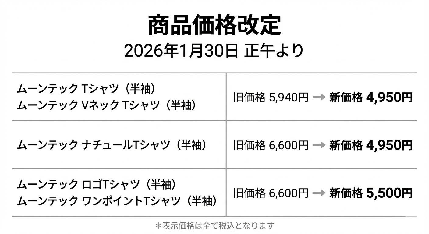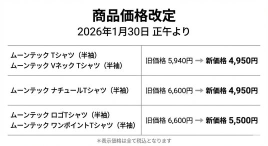 東レ発のスピンオフベンチャー、MOONRAKERS TECHNOLOGIES株式会社(所在地:東京都中央区、代表取締役:西田誠、以下MOONRAKERS)は、2026年1月30日(金)正午より、主力商品である「ムーンテックTシャツ」シリーズの大幅価格改定(値下げ)を実施します。