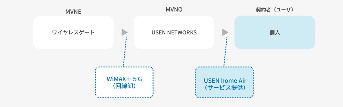 本協業は、MVNEであるワイヤレスゲートが展開する「WiMAX+5G」を活用し、当社がMVNOとして「USEN home Air」を個人向けに提供するスキームです。