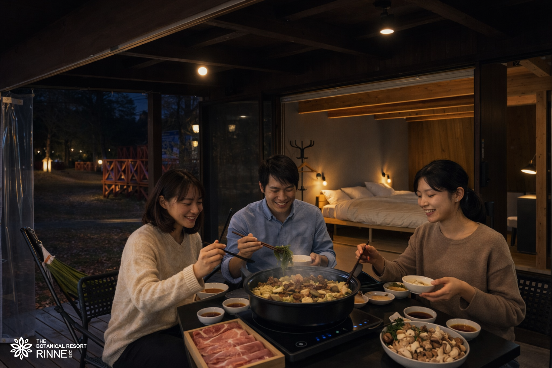 日本初の“泊まれる植物園”※「THE BOTANICAL RESORT 林音(ザ ボタニカルリゾート リンネ)、以下:林音(リンネ)」は、2026年2月1日(日)~4月30日(木)限定で、茨城のブランド豚「常陸の輝き」・ブランド鶏「つくば鶏」と、地元農園七会(ななかい)きのこセンターのきのこをふんだんに使用した、つゆしゃぶor水炊き鍋が選べる贅沢鍋フルコースプランの予約を開始いたしました。本プランは宿泊するコテージやグランピングに備わる暖房完備のプライベートデッキで、鍋をはじめとするフルコースを楽しめるプランです。