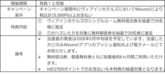特典として期間中にヴィアインホテルズにおいてWesmo!によりお支払いいただくと、WESTERポイント(基本)が通常の14倍となる7%即時還元するほか、抽選により無料宿泊券や無料朝食券が当たるW特典を用意しています。