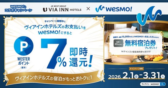 西日本旅客鉄道株式会社(本社:大阪府大阪市、代表取締役社長:倉坂昇治)と株式会社JR西日本ヴィアイン(本社:大阪府大阪市、代表取締役社長:柴崎紳一朗)は、2月1日から3月31日までの間、JR西日本グループのJR西日本ヴィアインホテルズで、JR西日本のスマホ決済アプリ「Wesmo!」とのコラボキャンペーンを開催しますのでお知らせします。