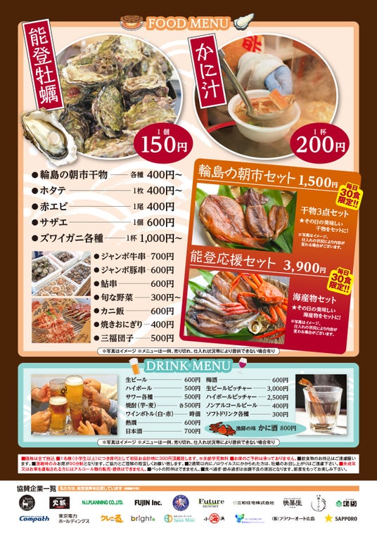 より多くの方に能登の魅力を感じていただくため、一部メニューを協賛価格でご提供いたします。