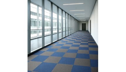 「防炎タイルカーペット」は、JFRAが定める防炎性能試験に適合して、「材料ラベル(青ラベル)」を取得した床材。消防法に基づく防炎基準を満たしており、施設用途での使用にも対応している。