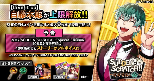 イベント期間中、KILLER SCRATCH!!をプレイするとライズ消費量に応じた確率でSUDDEN SCRATCH!!が発生します。SUDDEN SCRATCH!!をプレイすると、通常の報酬アイテムの他、限定アイテム「SUDDENコイン」を獲得することができます。「SUDDENコイン」を集めることで、「A.R.B remix」楽曲やレイズキー、オオサカ・ディビジョンのデコステッカーに使えるブースターなどと交換することが可能です。また、ストーリーカード「SSR【Live it up】白膠木簓」が上限解放され、最大9枚まで獲得できます。さらに、SUDDEN SCRATCH!!~Special~の開催時には10枚目が獲得可能となり、10枚集めるとカードストーリーがフルボイスに!詳細はアプリ内お知らせをご確認ください。
