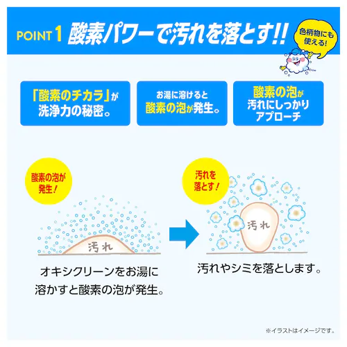 お湯に溶かすことで酸素の泡が発生し、血液汚れ・黄ばみ・汗ジミなどにアプローチ。色柄物にも使えるため、普段着から子ども服まで活躍します。