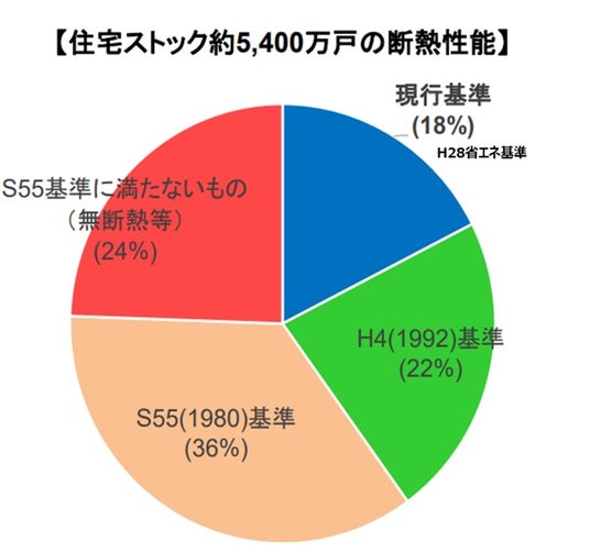 2050年カーボンニュートラルの達成には、CO2総排出量の1/7を占める家庭部門の脱炭素達成が重要ですが、現行の省エネ基準を満たさない住宅が2024年時点で約82%(約4,400万戸)、そのうち無断熱の住宅は約24%(約1,300万戸)と推計されています。この未達分の住宅を新築住宅だけで置換できれば理想ではありますが、現在の新築住宅着工ペース(年80万戸、2040年には年50万戸に減少との予測)では2050年のカーボンニュートラル達成には間に合わないため、既存住宅の断熱・省エネリフォームが必須となっております。