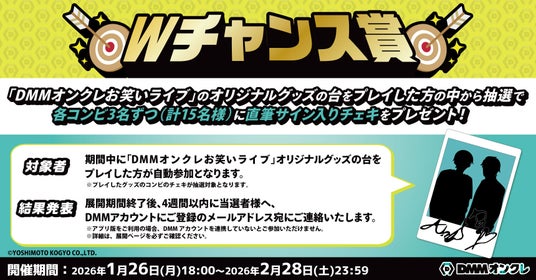 「DMMオンクレお笑いライブ」のオリジナルグッズの台をプレイされた方の中から抽選で各コンビ3名様(計15名様)に、直筆サイン入りチェキが当たるキャンペーンを開催します。