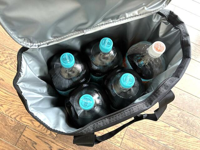 縦36㎝×横31㎝×厚み25㎝で、2Lペットボトルが縦に5本入る大きさ。
