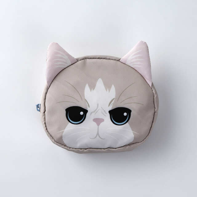 バッグの中央に猫顔のポーチがついており、バッグ部分をくるくるっと畳むとポーチの中にコンパクトに収納できるすぐれものです。