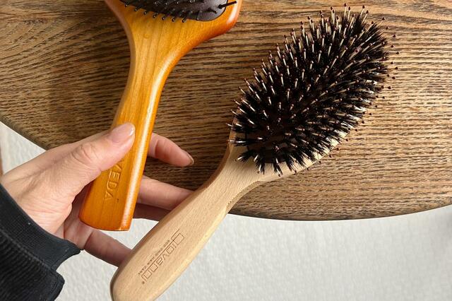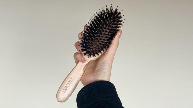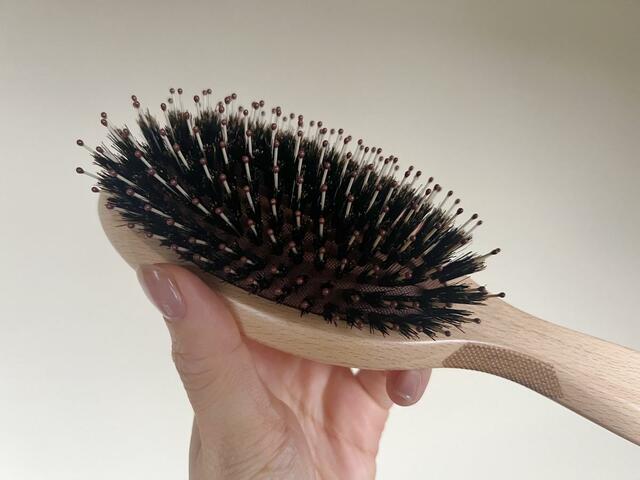 とかすだけで髪のツヤを生むというプロ仕様のヘアブラシで、天然の猪毛と頭皮をマッサージするナイロンピンが組み合わされています。