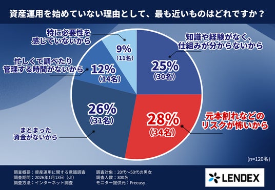 そこで株式会社LENDEX(本社:東京都渋谷区、代表取締役:中村 智)は、20~50代の男女300名を対象に、資産運用を始めていない理由や、心理的ハードルに関する意識調査を実施しました。