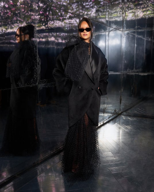 リアーナは、ブラックのフィッシュネットとチュールのドレスに、ブラックのウールコートを着用し、ディオールのアクセサリーを合わせた装いで登場しました。