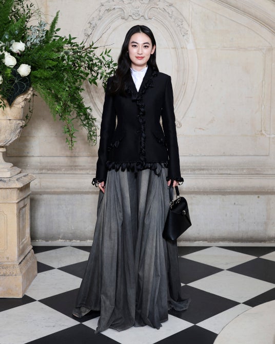 八木莉可子は、2026年フォール コレクションより、ホワイトのコットンシャツとグレーのコットンパンツ、ブラックのウール&シルクジャケットを纏いました。