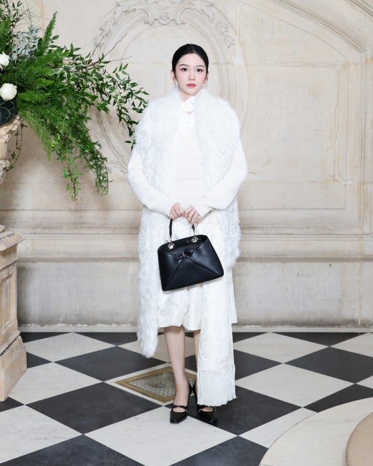 ジョウ・イエは、2026年フォール コレクションより、ホワイトのフェイクファースカーフを、ホワイトのウールカーディガン、コットンシャツ、シルクスカートと合わせて纏いました。