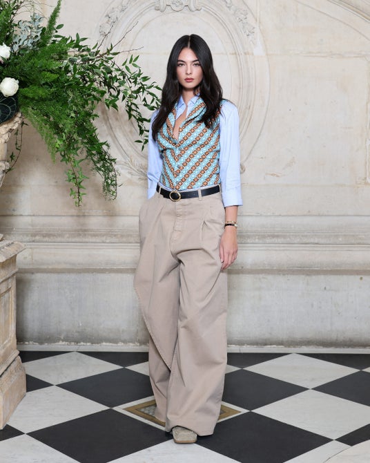 ディーヴァ・カッセルは、ブルーのコットンシャツとベージュのコットンパンツに、マルチカラーのノースリーブカーディガンと、ディオールのシューズを合わせました。