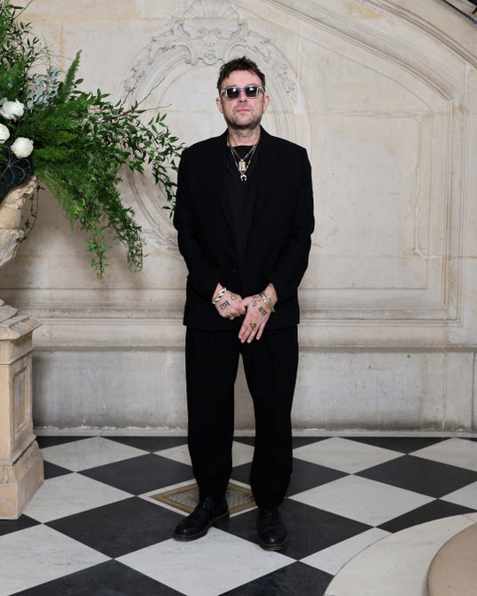 マイク・ファイストは、ブラックのウールコート、ブランデンブルク刺繍が施されたホワイトのコットン&シルクシャツ、ダークブルーのデニムジーンズ、そしてブラックレザーの「ディオール アーチー」ダービーシューズを着用しました。